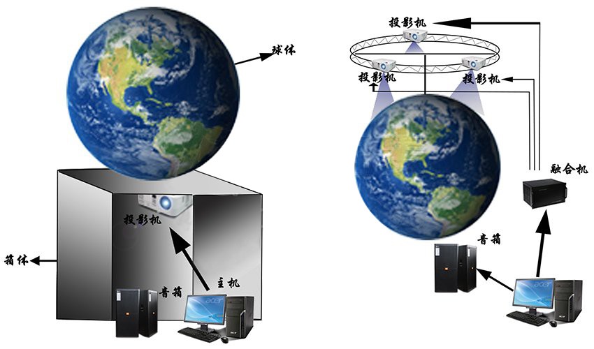 球幕投影系统是一种新兴的展示技术,它打破了以往投影图像只能是平面规则图形的局限。系统通过投影与边缘融合技术相结合,能够在一个球体表面上显示出连续无缝隙全方位的影像,使整个产品体现出极其科技感、立体感、震撼的视觉效果,并能保证画面不变形,画质清晰,色彩艳丽。球幕投影主要分为内投球和外投球。