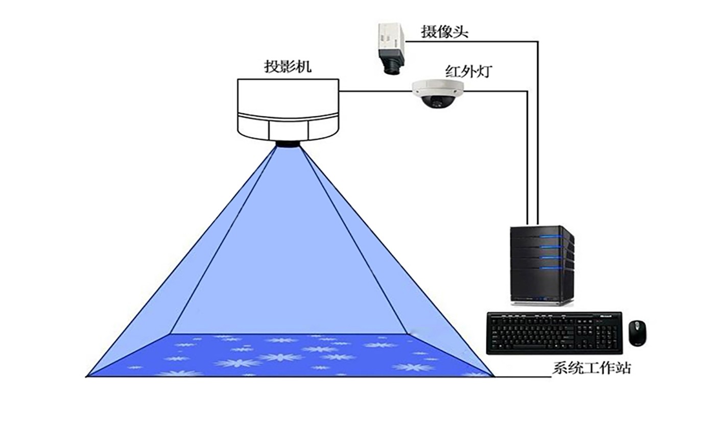 地面互动投影系统是由投影机、摄像机、红外感应器、互动交互软件、采集识别软件以及互动内容软件组成。