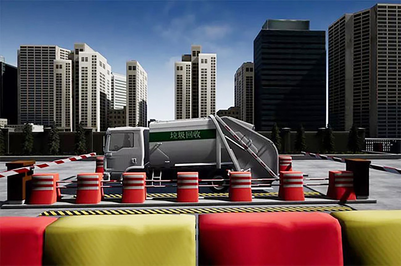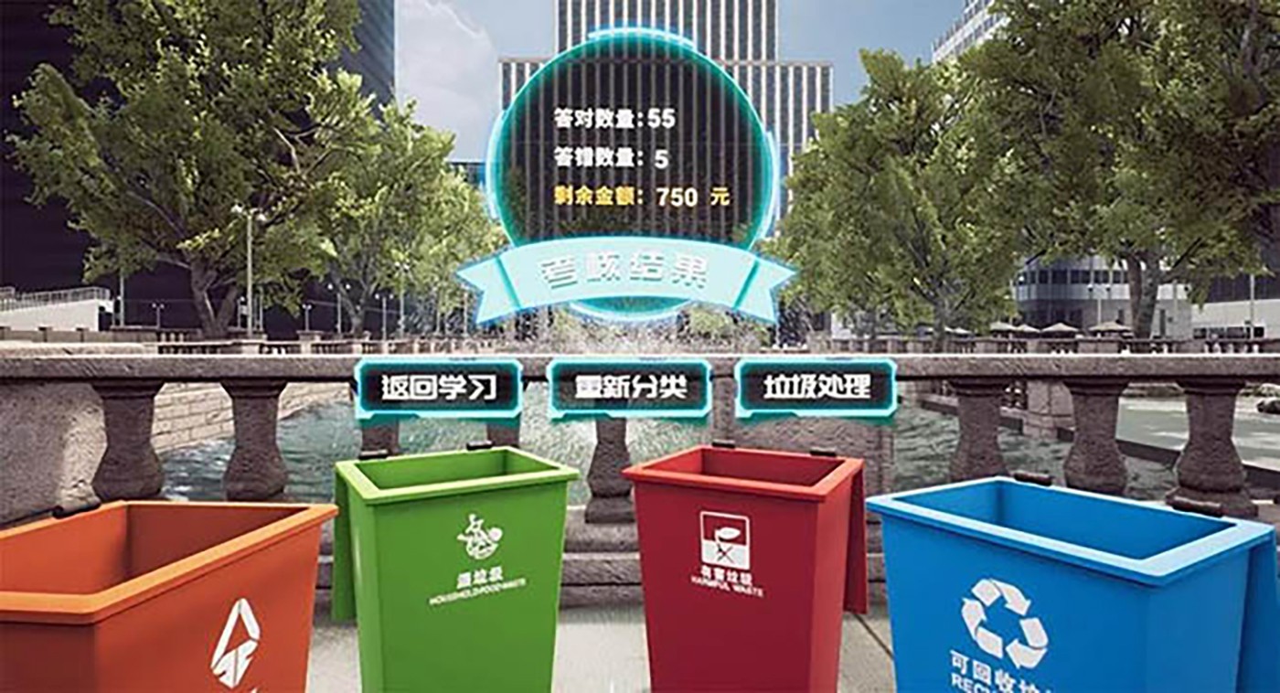 在VR垃圾分类游戏场景中,体验者可以看到四个不同类别的垃圾桶,游戏前会有垃圾分类的知识介绍,然后就可以在游戏中拾取垃圾并将垃圾分类到垃圾桶中,游戏最后会出现一个垃圾分类的考核结果,考核不过关可重新学习或重新分类游戏。